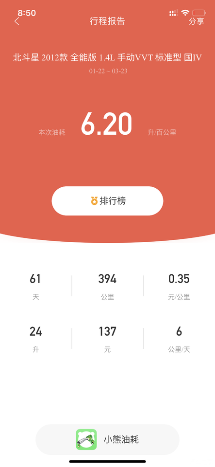 冬天一直6个多,最近加了6,45一升的中石油,油耗降到5.5,还不错,可以接受。小熊测试的油耗,可以做个参考数据,行车电脑显示5.9左右。所以软件测试的和行车电脑测试的挺准确,非常满意了,本人开车比较慢,平常基本都是4档60 5档70。都很少上80。总觉得开的慢才会安全,遇到突发事件可以来得及刹车,同级别同排量的车平均大概6个多7个油 呢,所以小星星能跑到这个油耗非常满意满足了,毕竟是车就要费油的,想一点不费油那就骑自行车去吧。