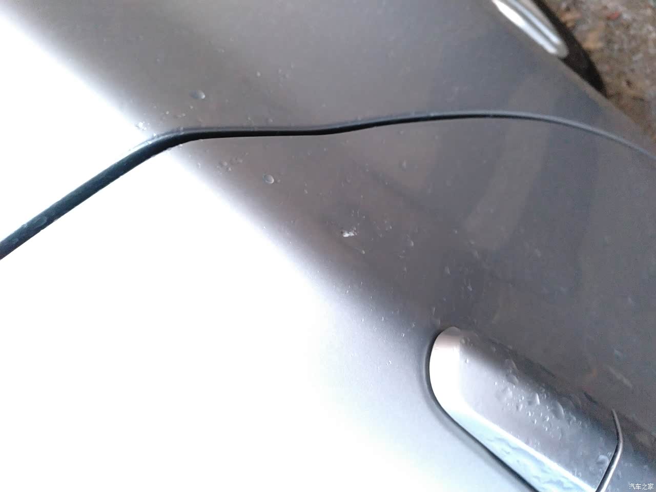 从这张图片上可以明显的看出来车子俩门都重喷过漆,只是手艺不精,能看出来。当时也不知道是自己开的时候没注意被树枝划的还是小孩儿给划的,从前门一直到后门很长一道的划痕,我懒得理一直没管,我爸买了划痕修复套装自己试了一下就是这个效果了。。。