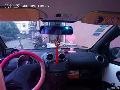 我选的白车,黑色仿赛车内饰,座椅是织物材料,带小表,我把cd机换成导航一体机了,瞬间高大上了,内饰做工一般,成本在那,可以接受。前门车窗开关在手刹前面,要弯腰操作,这点不太人性化,其他还好。