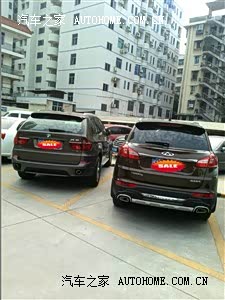 见过的人都说好看,本人当然也觉得好看。前脸很霸气,45度角最让人难忘,大家都说的从后面年高瘦我没觉得,我的车是棕色的,车漆很亮,跟堂兄的X5停放在一起气场不差呀,自我感觉良好一下。