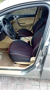 土黄色加黑色,典型的家用车范,我买了棕色全包围毛脚垫,加上黑色点缀红色缝线全包座椅套。看着很顺眼!
