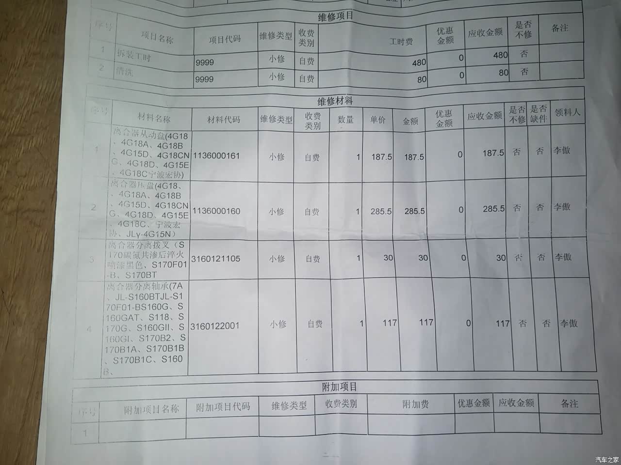 本次保养周期那主要是更换了离合器三大件。前段时间离合器变速箱位置有哒哒的异响,轻踩离合器消失,怀疑离合器片磨损,就没有去检查。后来踩下离合器又有明显的铛铛声音,担心又更大问题进站检查怀疑是离合器压盘或者是变速箱四角轴承问题,但都需要抬变速箱检查,后发现是离合器从动盘磨损,维修师傅说都十万公里了也应该更换了,因为只更换从动盘以后压盘还要更换,所以把压盘从动盘,拨叉,轴承都更换了,材料费加工时及清洗合计1180元,由于比较熟悉实际收880元。耗时2天。