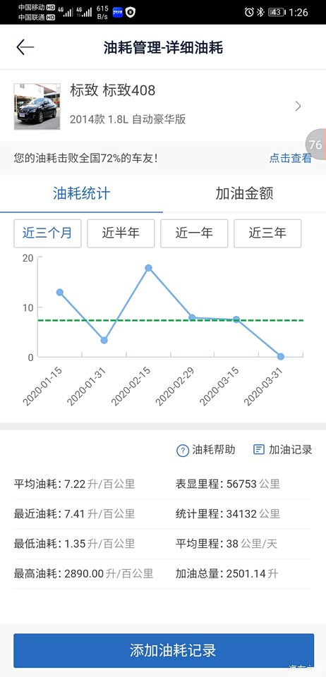 除了烧点机油整体还不错,我开车处于那种一路往前冲的,大脚油门,高速180,油耗能在这个水平,我这个发动机应该是全系最好的一台了,哈哈哈,有可能说过了,自我感觉油耗相当好了,我们自己的408圈子里也是油耗最低的,我很欣慰