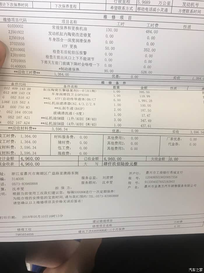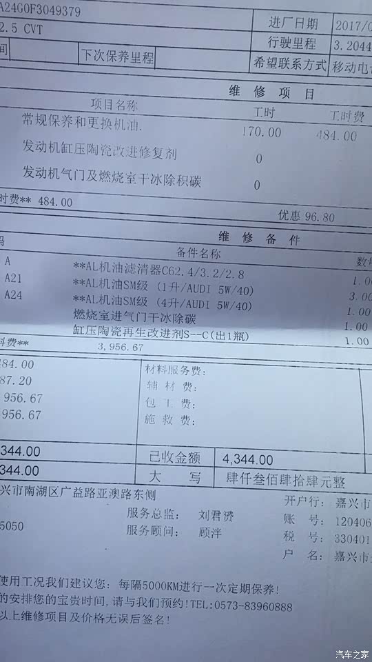 保养基本没什么可说,一成不变的排队进号,还不逢时的赶在年前首保,排队排的疯掉,4800做的首保,保养单下来说加了7瓶机油、有点傻眼,以前自己523才6瓶,难道V6机油底壳要大?没有细纠结,顺便提一下,首保加的免费机油是SM级别,建议后期大家自己还是加SN级别,这样万把公里做一次保养比较好!至于大家说的首保后说的发动机声音变响,我未发现,但油耗也未明显下降!仅作参考!