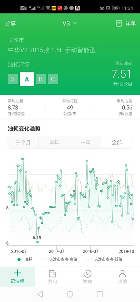 平均油耗8.75,除了每年回几趟老家走几百公里高速以外,基本上都在市区上下班,四年7万公里用的不多也不少。按理手动挡应该要省油的,1.5L手动档加1.3吨的的重量这个油耗偏高了,感觉国产车的油耗都要高一点点。
