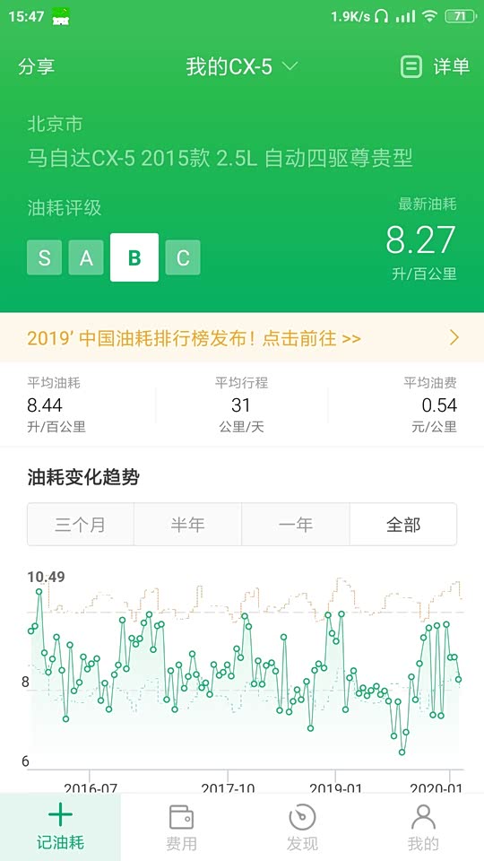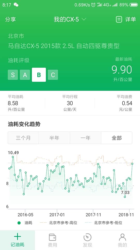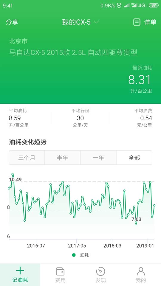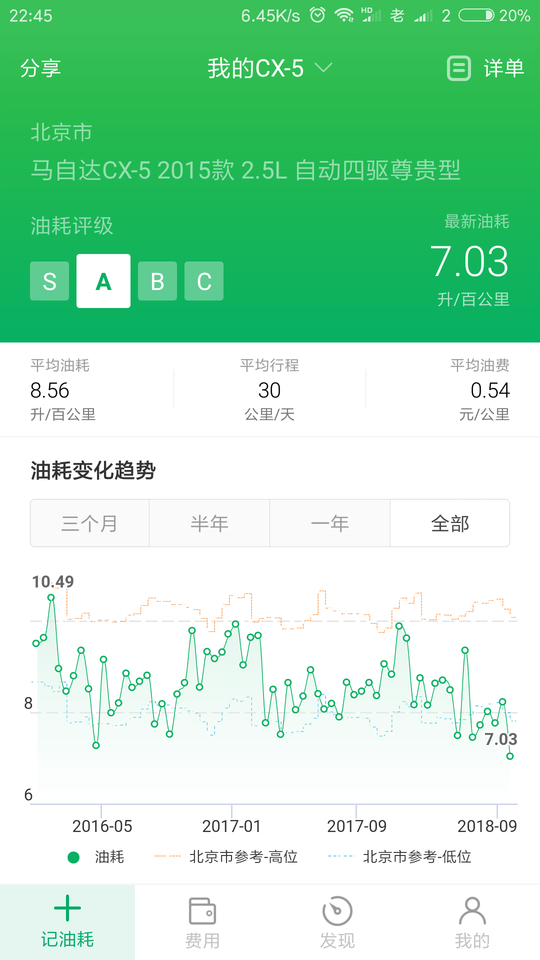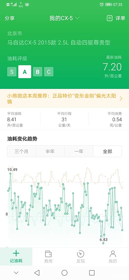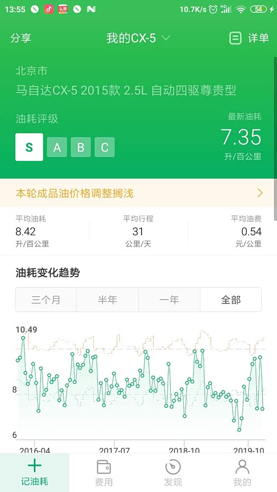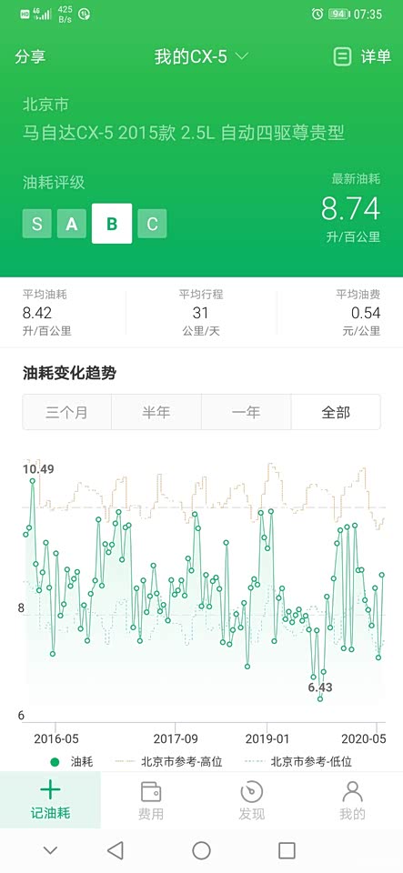 最近一年多油耗有所上涨,主要跟搬家以后路况复杂,红绿灯变多有很大关系。跑高速倒是没什么变化,开空调120的时速还是8个半左右的油耗。其实记录油耗的习惯不是为了算计钱,主要是通过油耗的变化来察觉车辆的状态是否正常。这个可能很多人都不知道。最近孩子放假出去玩了几天,高速的表现还是和以前一样,这挺好。
