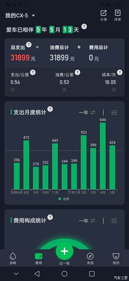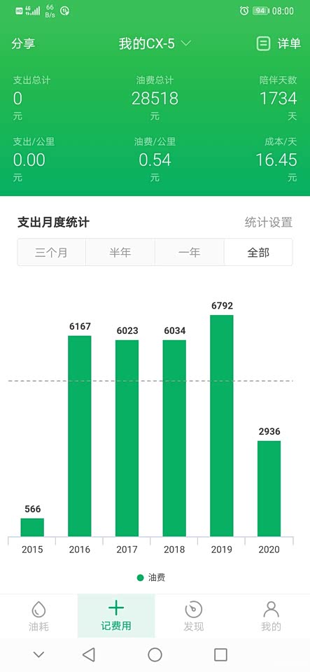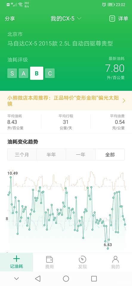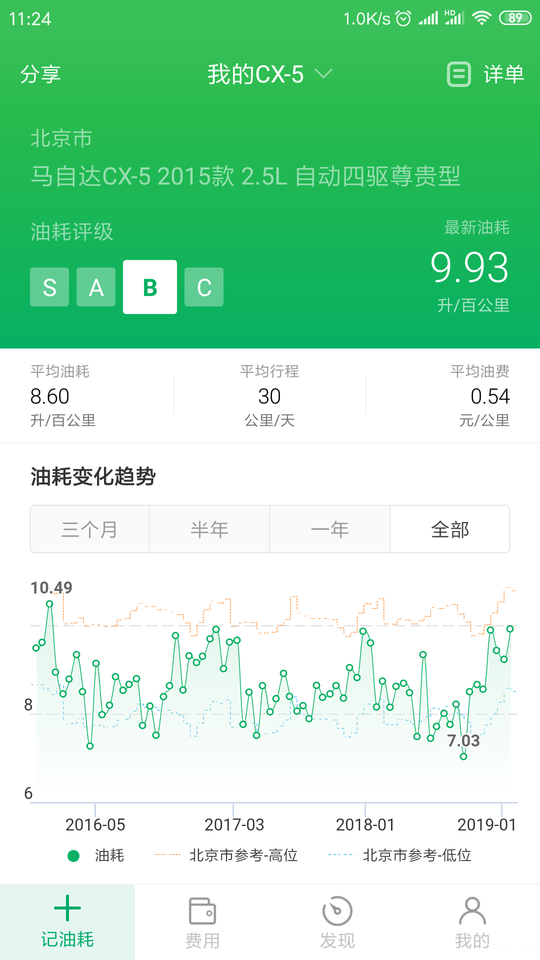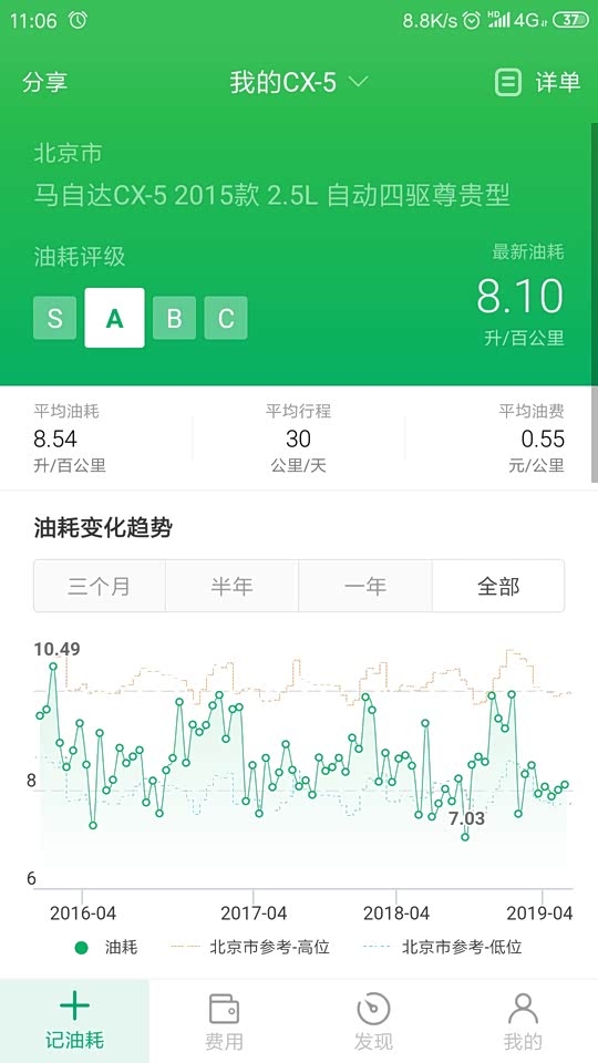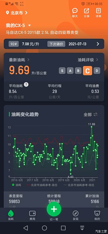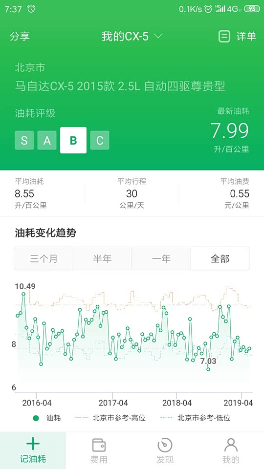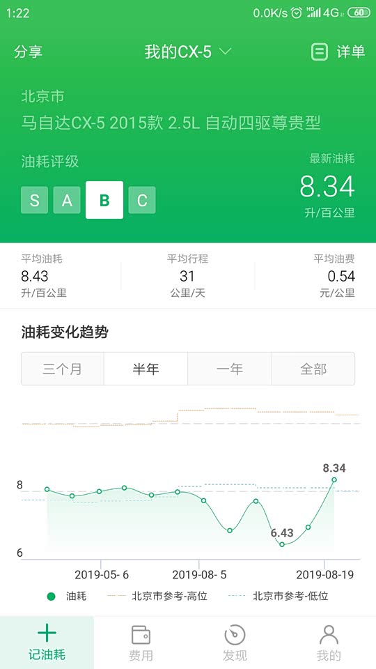 最近一年多油耗有所上涨,主要跟搬家以后路况复杂,红绿灯变多有很大关系。跑高速倒是没什么变化,开空调120的时速还是8个半左右的油耗。其实记录油耗的习惯不是为了算计钱,主要是通过油耗的变化来察觉车辆的状态是否正常。这个可能很多人都不知道。最近孩子放假出去玩了几天,高速的表现还是和以前一样,这挺好。