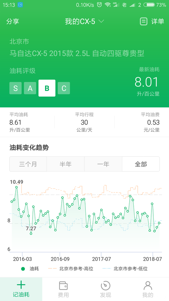 快三年了,平均8.6的综合油耗已经很满意了。我住在北京的南城四环里,上下班走南四环基本不堵车。好多人买了这车开开就说没有宣传的那么省油啊!有车友油耗低又说是拖啊!其实真没必要纠结这个,决定油耗的因素很多,路况、天气、驾驶习惯都会对油耗变化产生影响。同一个车两个人开还会出现两个油耗呢,更何况有堵车的还有天天一马平川的。天气也是,东北地区半年冬天光热车就热很长时间不费油才怪。