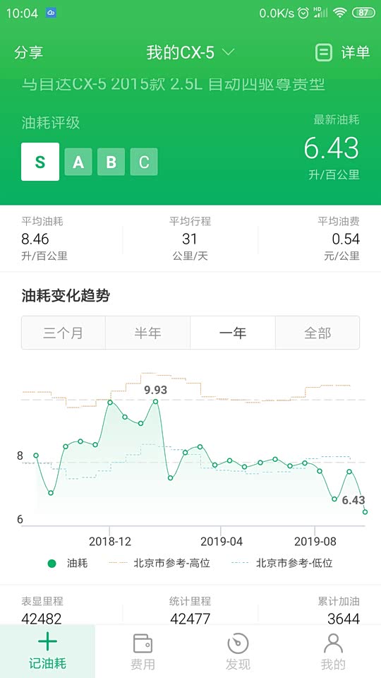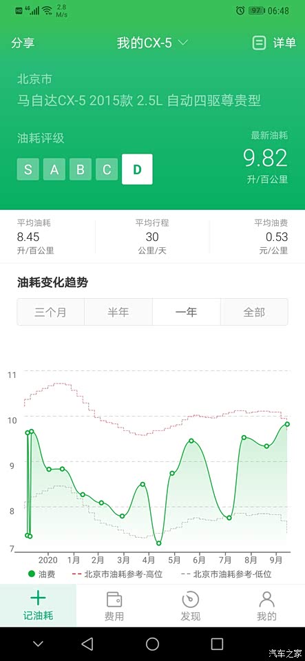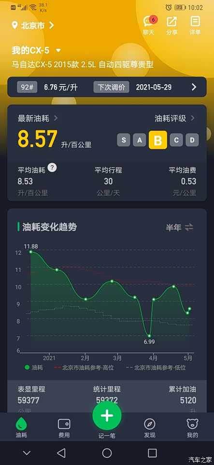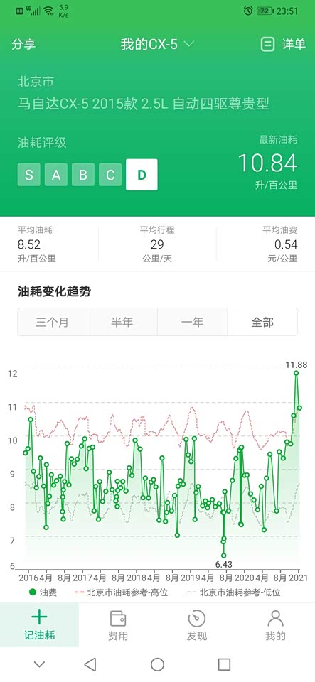 由于最近天气转凉再加上搬家后上下班距离缩短,路况也不如原来顺畅,所以油耗升高了。现在在百公里10升左右,估计还会升高,毕竟还没到最冷的时候呢。