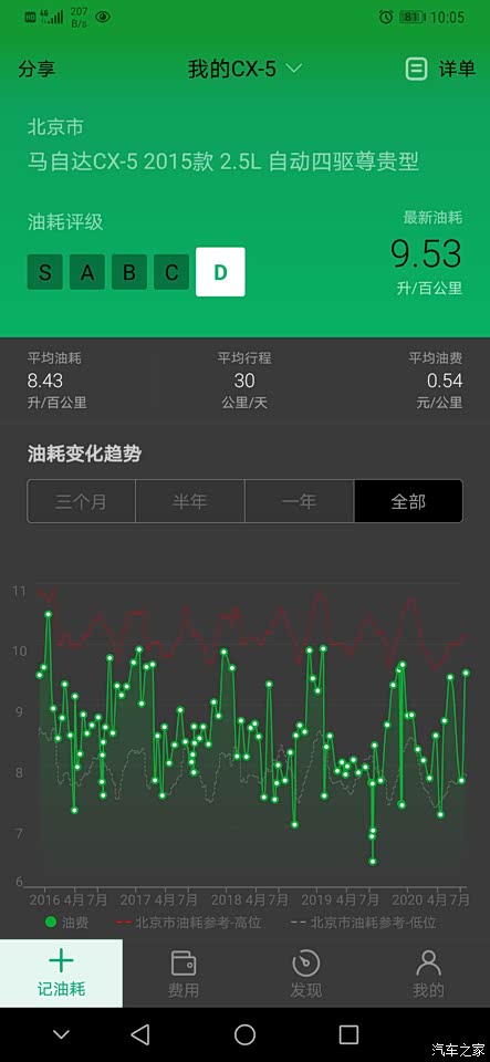 天气越来越热了,油耗比冬天要低了点,但是北京的路况确实真的堵。所以现在保持在9.5升/百公里也算不错了,毕竟排量是2.5升的。五一带家里人出游,高速那叫一个堵,7个小时才开了150公里!平均下来8.5的油耗已经知足了。
