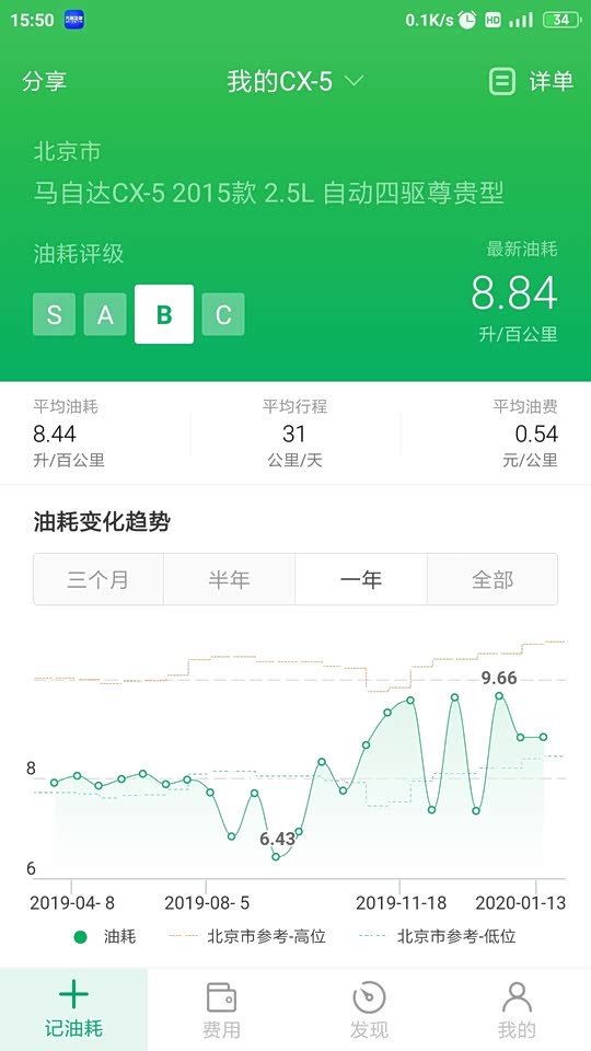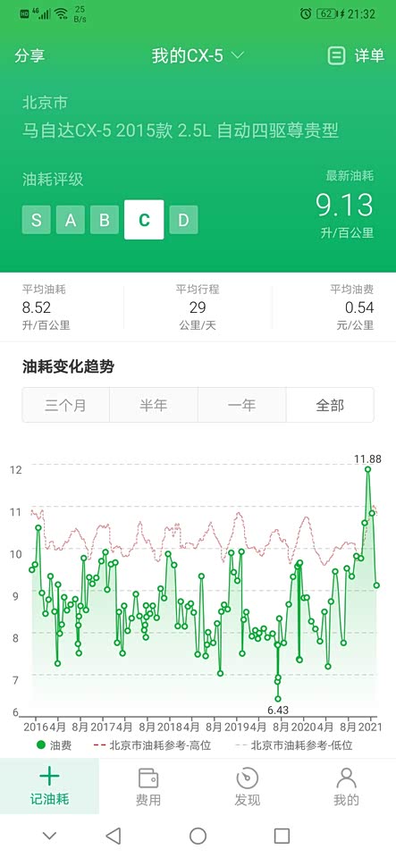 最近半年由于诸多原因油耗一直偏高,冬天寒冷、搬家后距离单位近了一半路程、早上送孩子的路况极差等等,各种原因造成现在的油耗居高不下。不过天气明显转暖,希望油耗也能下一个台阶。