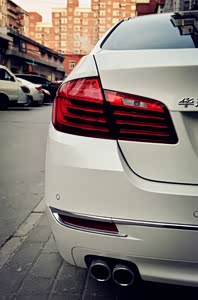 宝马车型外观独特,长长鼻子,识别度非常高,整体设计感虽然不激进,但是比例很完美,车身修长,腰线立体感十足,经典的霍夫迈斯特拐角以及鲨鱼鳍天线,就如同婀娜多姿的少女,看了就让人流口水。尾灯夜间效果非常棒,前大灯经典的圆润天使眼设计估计会成为宝马旗下最后的绝唱,众所周知宝马旗下其它车型大灯都已经开了眼角,下一代5系必然也会向新的家族式前脸靠拢。个人还是喜欢没开眼角的设计,而且LED灯组光圈为平切设计,我的审美实在无法接受。