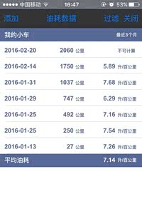 目前2000公里了,还没有做首保,用了小熊油耗软件测试,目前加了790块钱的油了,总共跑了2060公里了,平均下来7.13个油/百公里,投不到4毛一公里,其中包含高速市区郊区,有堵车。感觉在堵车的时候油耗特别高,在10个油左右。高速很低不到6个,郊区7个油左右。
