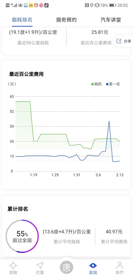 马上要过春节了,不过今年杭州冬季的温度并不低,0度以下的气温印象中还没有经历过,所以,对于新能源车来说,这是一个非常友好的冬天,除了开暖气的因素,因为低温影响电池活性影响续航里程的因素几乎不存在。所以,即便在冬天也能纯电行驶52至55公里。