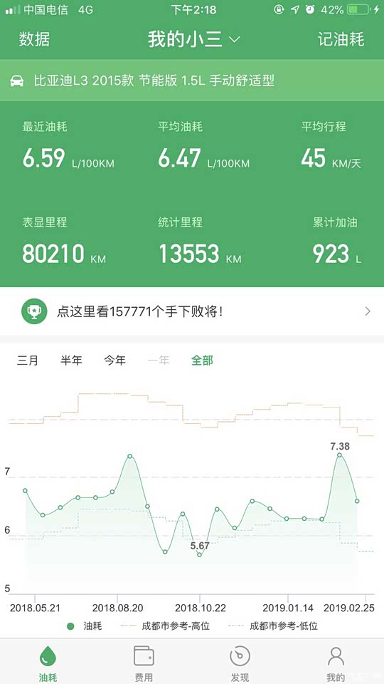 :油耗方面比较满意,按现在的油价每公里都不到4毛,我现在都加97#了。百公里降到6升以下了,每公里还比之前的93#便宜点,而且动力明显好很多,油耗相当满意。