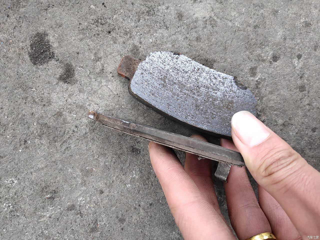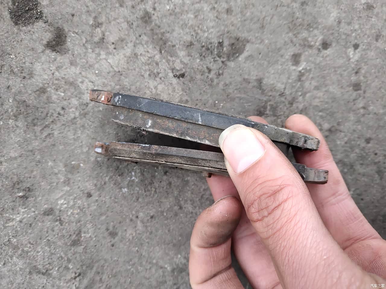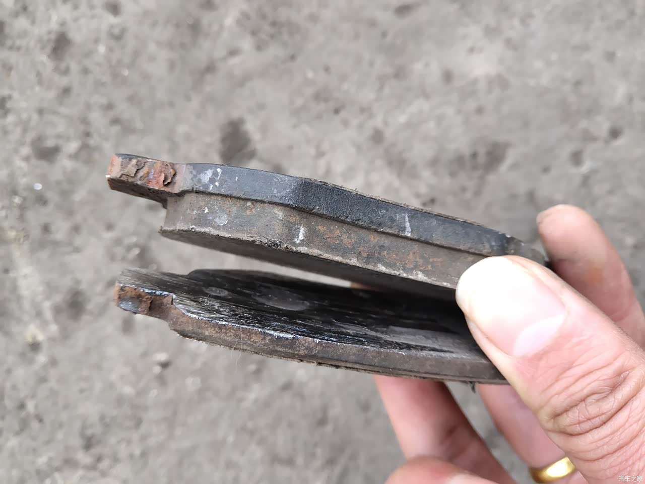 这是右轮的,不知道怎么回事刹车片磨得不均匀,一边都磨完了,另一边还有这么多。