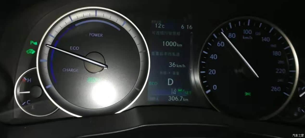 前挡风玻璃不结实,石子打一下居然就裂了,而且裂缝天天增长,从15厘米一直到60厘米长,用玻璃修补胶粘了一次,过了一个月居然又往前裂,只能再粘。没上玻璃险更换要6800,太贵了!听到周围开ES朋友修理费动辄几万元,要小心。 剩余行驶里程的显示仅供参考,可能因为油箱上下宽,中部窄,油耗不变的情况下剩余行驶里程估算值波动很大。我每次加完油都显示剩余行驶里程1100-1200公里,哪次也没开到过。 基本上汽油报警灯亮时剩余行驶里程70-100公里,每次都开不到1000公里,剩余行驶里程不显示时再开40公里内我会去加油,一般能加55-57升,最多一次加油量57.14升。看到论坛里有人最多加过60升,我是没敢尝试。 总之汽油报警灯亮时再开150公里是没有风险的,油箱里应该还有至少6-7升汽油,不会把汽油泵烧了。 一直在关注EV灯何时会亮?希望下次写口碑时弄明白。貌似EV灯亮时发动机停转,反过来说,EV灯不亮时发动机就会运转,可能不喷油但只要增加了发动机运转的负荷,能量就会消耗一部分。