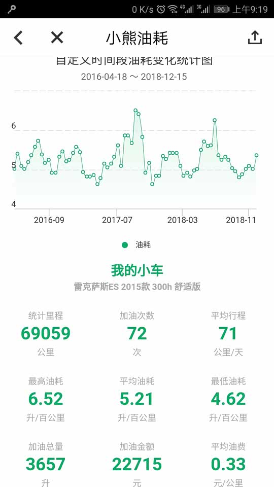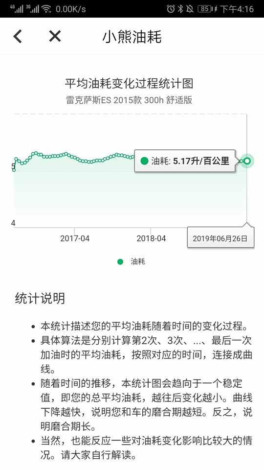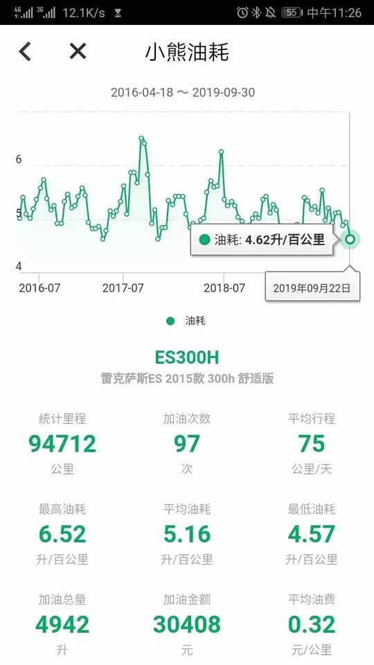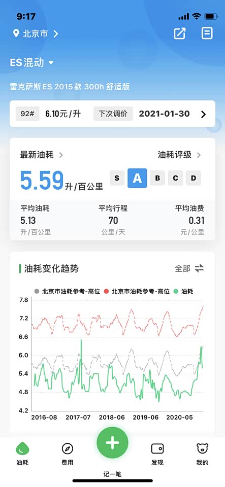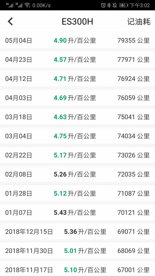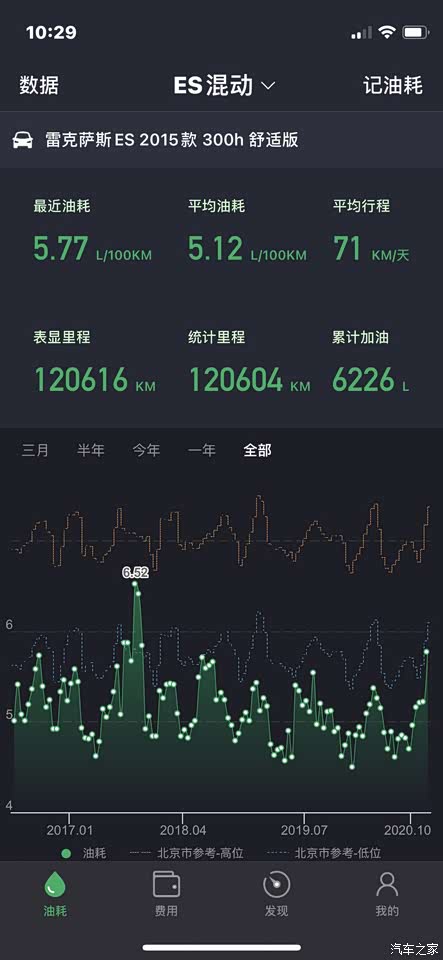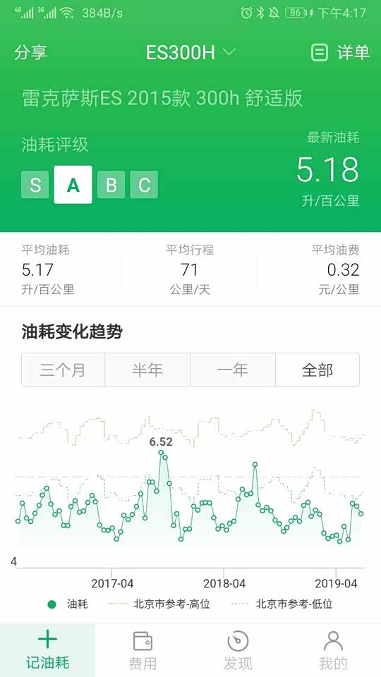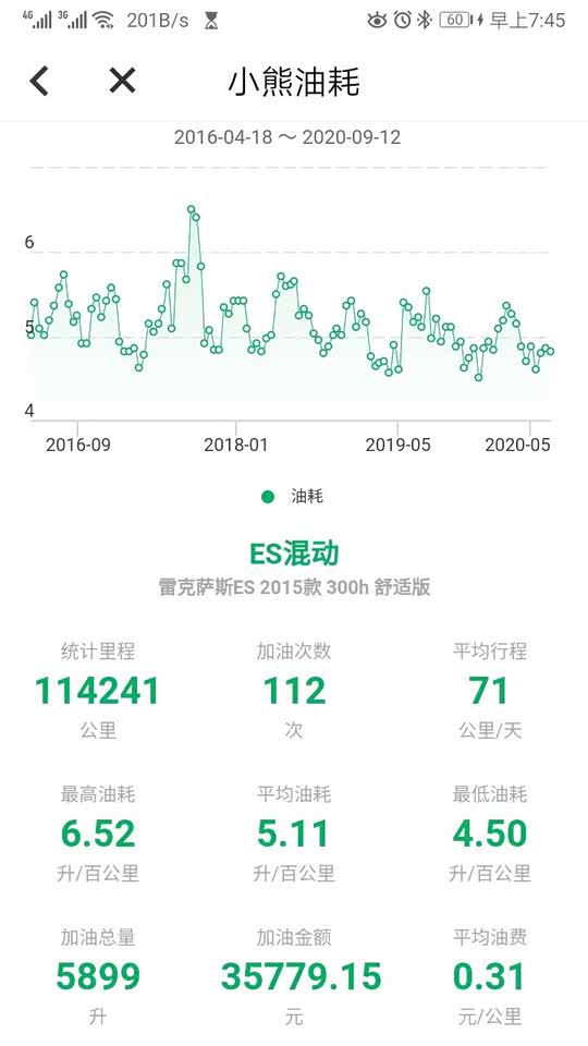 仍然非常满意,最近两箱油由于天气转凉空调不再频繁运行,分别5.39,5.16L/百公里。 4个半月已经开了10000公里,平均每箱油1000公里,这个还真没问题。 平均油耗显示5.2,实际测算5.29;最高油耗5.73,最低油耗5.01,平均时速长期稳定33公里/小时。 一直加92#汽油,10次加油总计2997.87元,实际行驶10001公里,平均油费0.30元/公里。 我的行驶路线相对固定,拥堵情况总体比较稳定,驾驶习惯已经过了变灯就一马当先的境界,开了这个车频繁并线的毛病好了许多,确实像老司机说的一样,行驶总时间没有太大差异,甚至高速如是。 开ES300H慢慢的会改变不良驾驶习惯,尤其堵车时听不到空调负荷引起的电子扇高速运转的噪音,在拥堵的车流里,10多分钟才会启动3分钟的发动机,心态会轻松许多,即使有人加塞儿也不容易路怒了。 对我来说影响油耗的主要因素就是气温了,北京最热的时候36,37度,油耗5.7。冬天还没经历,估计可能会超过6.0。