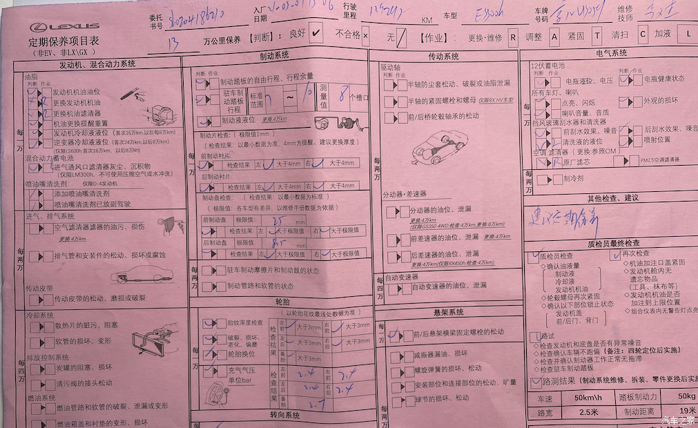 保养后的免费洗车太凑合了。后挡风玻璃好像根本没洗,一层土都在上面。更换标准:刹车片厚度<4mm, 刹车前盘<25mm, 刹车后盘<8.5mm。检测报告也不给个具体数值,难道真要等到出质保期后自费更换吗?再有2万公里或者一年质保期就要到了,还没想好后期是否还在4S店继续保养。