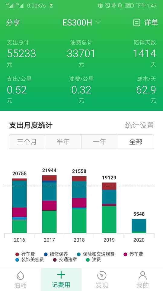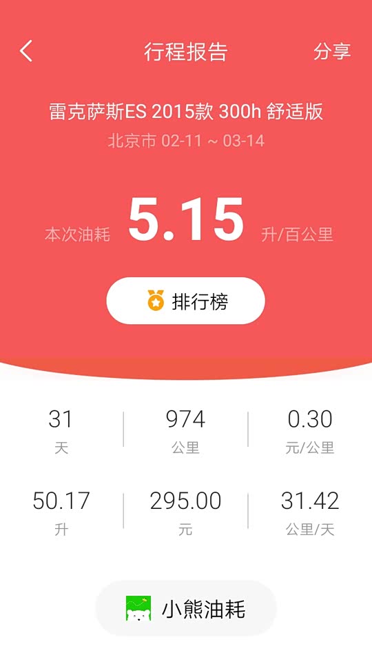 从未重置油耗,每次重置TripA,油耗不错平均5.1L/100KM,0.28元/KM。平均时速32KM/H。基本每次油灯亮可以跑1000KM以上。