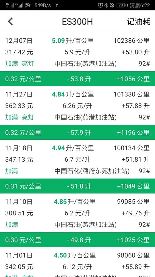 已经开了快一年,各种条件下的油耗基本都经历过了。 10个月行驶约2万公里,加油1095升一直92汽油,综合油耗5.28升/百公里折合0.31元/公里的汽油费。 基本都是上下班通勤,路线相对固定,路况也变化不大,平均时速常年在32-33公里范围。 最高油耗出现在夏季7月下旬5.73冬季年底5.58, 最低油耗春节后和十一后4.92-4.93。 启动后40公里以上的单程最低油耗4.2,就是上下班路线,不是连续下坡路。 短途行驶油耗最高,5公里以内冷车冬季能到8-9, 高速油耗偏高,定速巡航120很难低于6。 山路油耗不低5.5,上下坡发动机都会启动,电池电量很满但是没机会消耗。 ES300H混动最适合城市路况。它的舒适度和节油都是在城市路况中低速行驶优势明显。