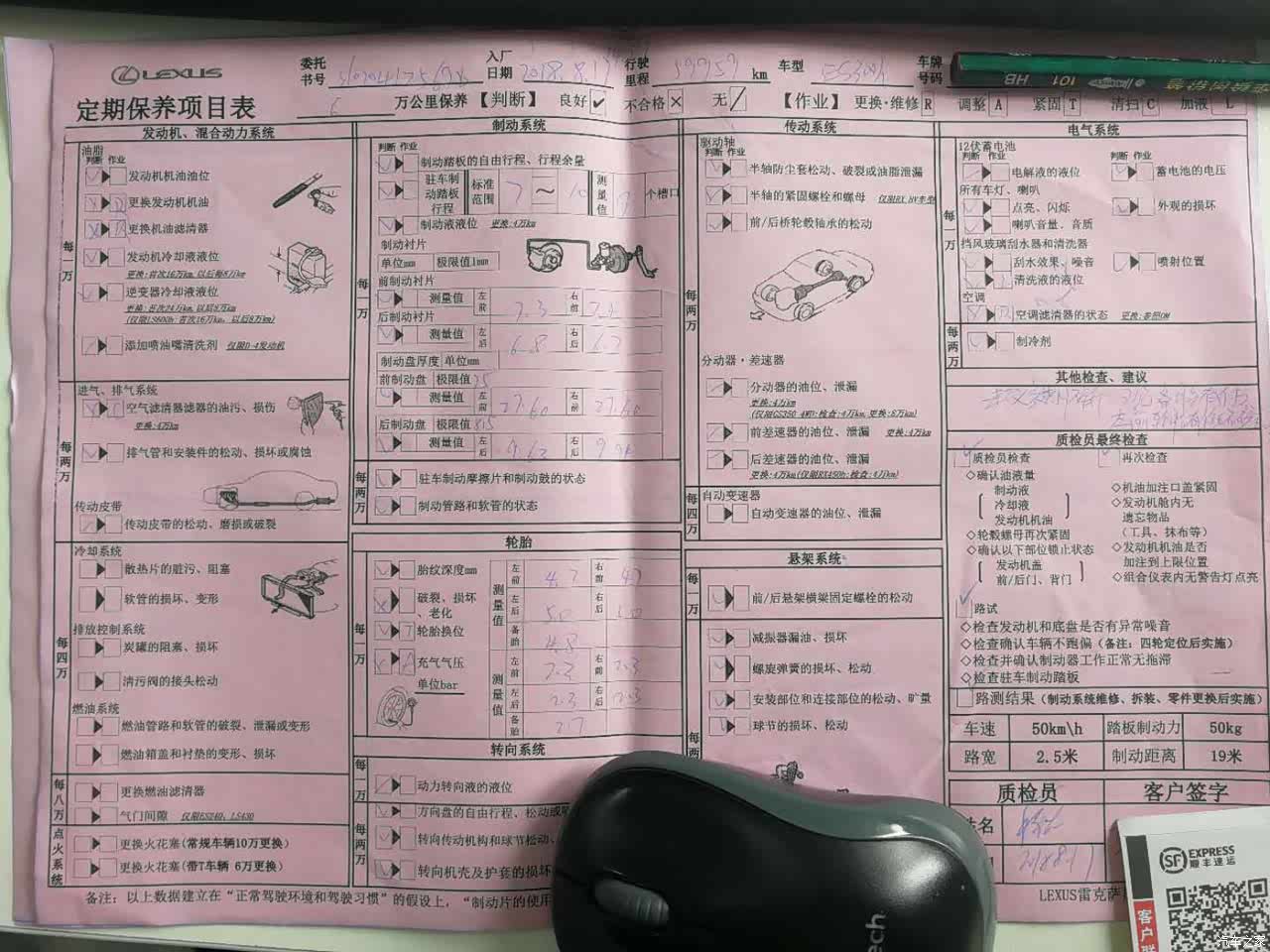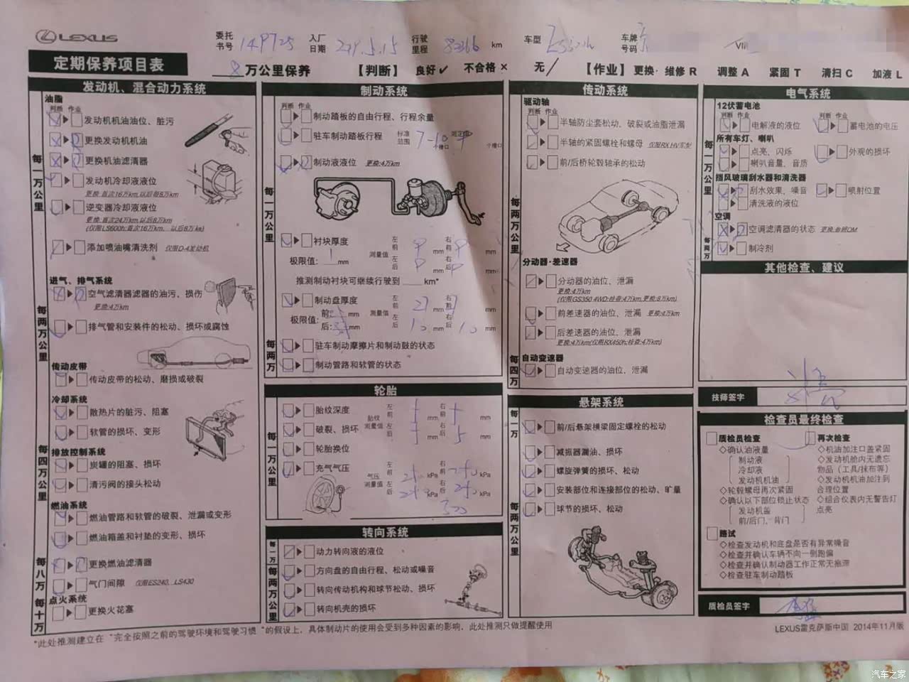 第十四次免费保养刚去了,没有跑到14万公里,英华搞活动,最后两次保养去它那里做出保赠送一次免费小保养。每次保养后感觉比较明显的就是油门踏板更加敏感了。特意关注了刹车盘,刹车片的磨损情况,肯定免费质保期内更换不上了。据说在4S店里自费换全套要6000多元,只能等到需要更换时再想办法了。咨询4S店里的技师说估计我前刹车盘要跑到20万公里以上,后刹车盘要跑30万公里,也就不纠结了。除了刹车盘和刹车片还有变速箱油也从来没更换过,这些都是出了质保期后自费的保养项目。ES300H保养确实做到6年质保期内保养全都免费了。这五年多来唯一的花费就是300元清洁了水箱和空调冷凝器加了个阻挡杨柳絮的护网。三滤更换,火花塞,刹车油,都是严格按照保养手册免费完成的。