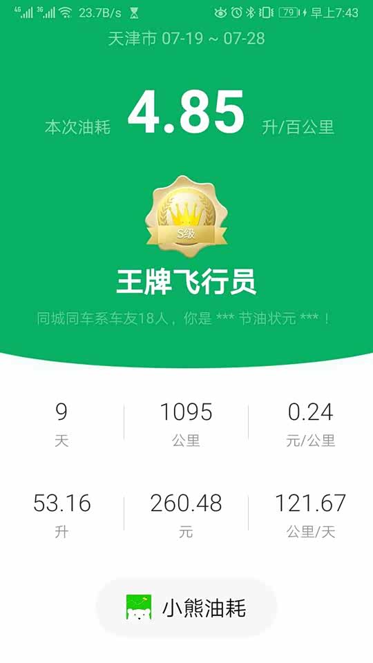 最近主要往返京津高速,比较省油上一箱油行驶1095公里53.16升92#汽油,平均油耗4.85升/百公里。最近天天下雨空调用的不多,当前油耗4.6升/百公里。1.5小时100公里的车程空调油耗大概0.3-0.5升。