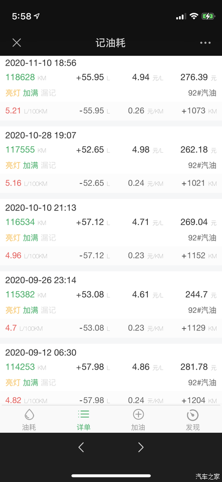 1163公里,55.94升92#汽油,油耗4.81升/百公里