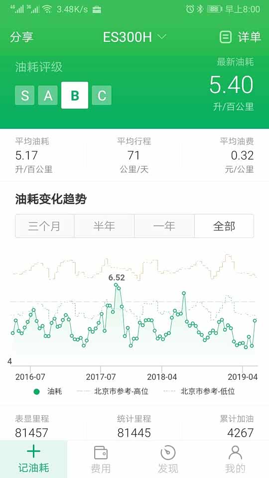 油耗4.61升/百公里,今年的最低油耗了,高速太多相比国道或者城市环路油耗略高,空调一半路程使用,早出不用,晚归需要。