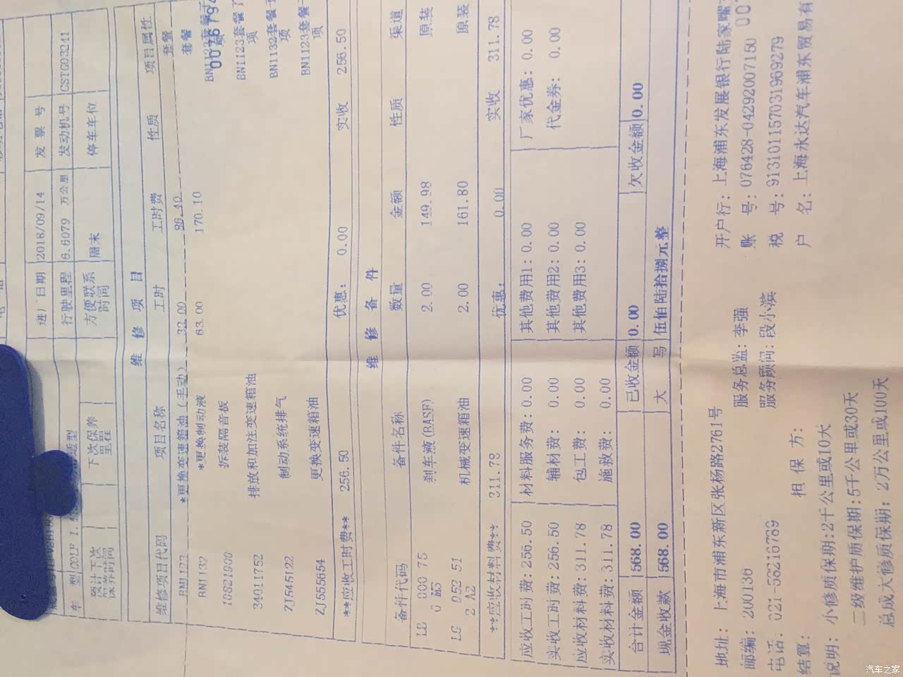 本月14号去4S店保养做换了刹车油、变速箱油,这两样新车至今还没换过,跑了6万多公里了,就换了一下。总花费568元,之前接到0431电话送了200元券抵扣200元,实付368元。防冻液目前还是购车时原装的。第二天去某虎换的机油机滤(保险送的小保养),说实话服务体验不是很好,提前约的15日上午9点30分,9点20分不到就到了那里,一直等到快11点才轮上。
