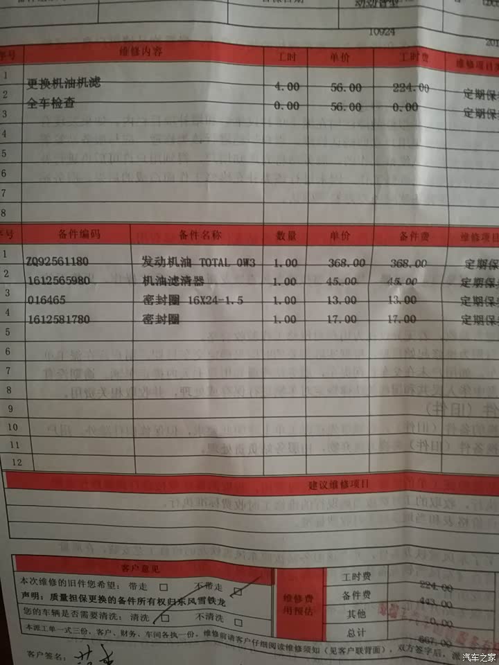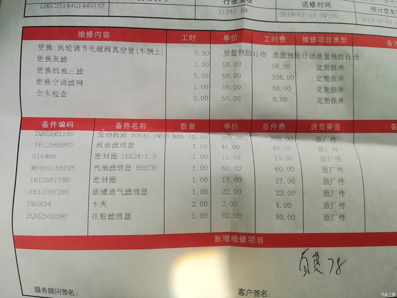 现在只弄了2次保养,都去的4S店,第一次首保应该是免费的,二保自费,做的就是常规的机油、机滤更换,根据大家的使用反馈,选用了4S店的0W-30的道达尔全合成机油,首保自己加了90元,二保的价格是667元,因为本人订的15款自尊没排产换的14款劲智,补了500元的维修基金,虽然卖我车的4S退网了,接手的那家4S还是让我使用了,这个点个赞,以后保内肯定还是会去保养的。