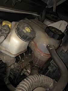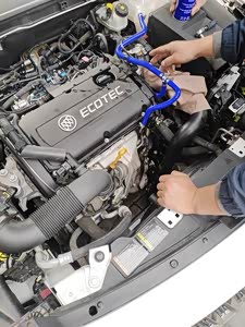 我的1.6T君威,车友们都说三通及水壶都是设计问题,太靠近发动机风扇又没有延时关闭的设计,所以三通和水壶很偶尔坏,我的也是一样,早上开车看到车底有水,再仔细一看是红色的,那肯定就是防冻液,打开前盖看到冷却液已经只剩下大半壶了,看这情况应该是早就在漏了,只是没有及时发现,不过也没看出来哪里大漏,但是三通水管底下也有冷却液的残留,我大概判断是三通水管或者水壶有漏,但应该是小漏,最烦人的事就是漏水。 发现有漏后我就把车开到了附近的修理店,让师傅检查详细情况,用肉眼看跟我看到的差不多,也是怀疑三通水管,后面师傅用加压小设备测试,经过师傅的加压测试,就看到了水管接头处有漏水,又检查了水壶的四周,没有裂和破的现象,判断水壶没有问题,最终锁定是三通水管的问题,其实早就听说6T君威的三通水管肯定要换的,修理店没有现货,要么从汽配城拿货,要么自己买好然后再来更换,付些人工费就可以。