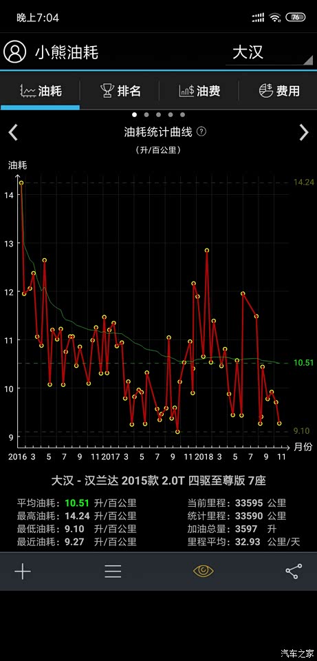 每天上班往返25公里,其中5公里城市路况,20公里国道路况,周末偶尔自驾游,高速路况跑的不多!一月平均加2次油!总体来说还是很省油的,毕竟自重超过2吨的大家伙,能取得这样的油耗成绩还是很满意!提车以来每次加油都用小熊油耗记录,油耗最低的一箱油跑出了9.1升/百公里!相当于普通家用轿车的水平!丰田的这款2.0t发动机的表现确实很棒!