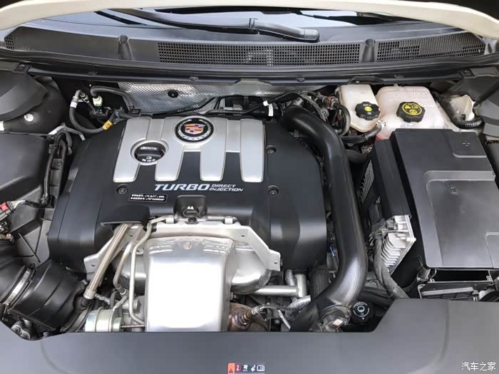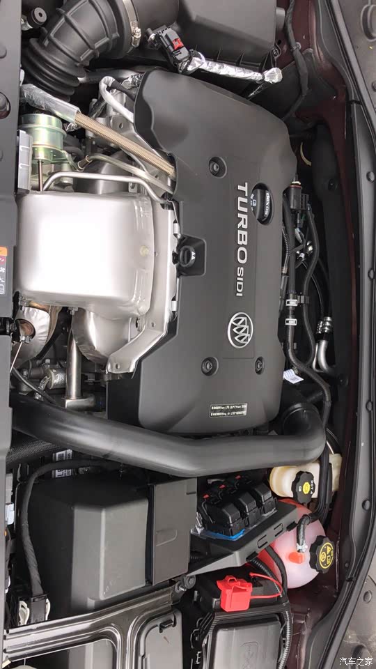 这是2.0T君越的机仓。盖上有铝箔隔热,一些管线也有,还有是双汽压杠支撑机盖的。