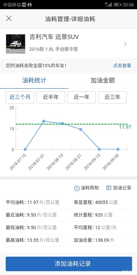 我是固定每次加200,然后报警继续加(长途例外)每一次加满我都会再之家登记一下公里,油量信息。方便统计油耗。 高速油耗120基本上都是8.5个油吧。 环城路段,城郊比较省,基本上7.5。每公里也就是5毛吧。 市区油耗不是很乐观,冬天的时候还好。基本上8毛左右。夏天空调需求大,我上次加200跑了210公里。这次200基本上250-260公里吧。 我无所谓,我每天都用车,但是跑的不远。基本上上下班用。差不多一周200油钱吧。总体而言。这车油耗不容乐观。