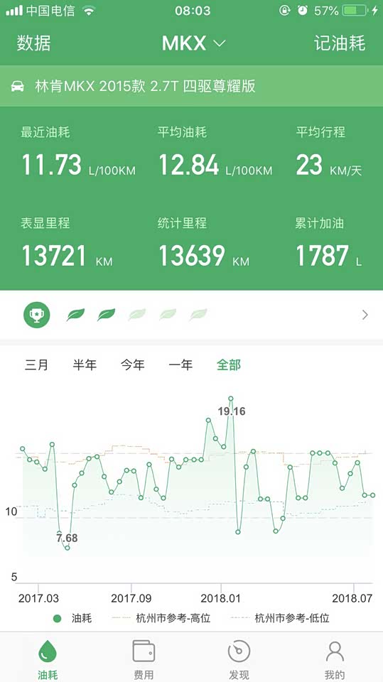 因为杭州的城区路况油耗实在感人,所以平时一般都开MKX进出城区,主要是城际之间跑跑和郊区路况为主,2000公里左右还没上高速,综合油耗14.5升/100公里,2000公里以后开始上高速,断断续续的跑了1000公里到2000公里的高速吧,油耗就下来了,在12升-13升之间,而且不是高速上油耗低,到了城区之后因为高速巡航过后,可能对于燃油经济型会有很大帮助。