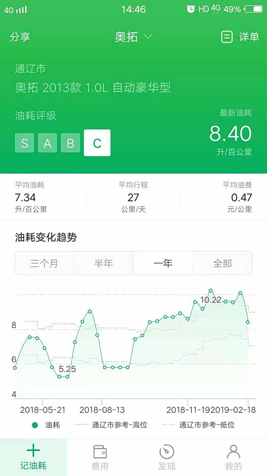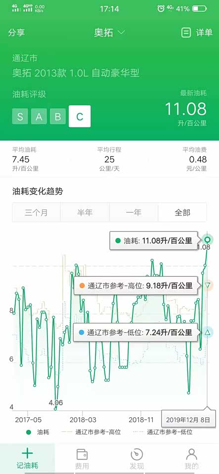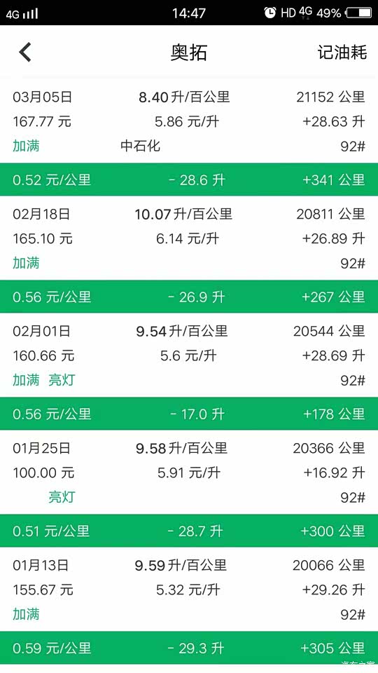 可能是磨合期的原因吧,全市区路段,合着每公里0.52元,感觉油耗偏高,希望后期能降下来