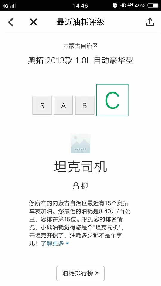 车一直是媳妇在开,最低油耗5.25升/百公里(告诉油耗),最高油耗10.22升/百公里(冬季-20度市区),最近一次平均油耗8.4升/百公里(最近天暖了油耗降点)。市区单程5公里,9个红绿灯,路况还不错一个红绿灯都能通过。这油耗.....用某油耗软件的话说“您是个坦克司机,开坦克开惯了,油耗多少都不是个事儿”