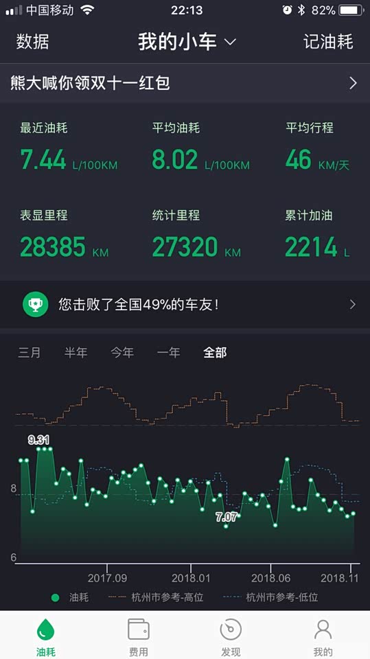 真实油耗如图所示。至于欢乐表么,要比真实的低1.2个左右