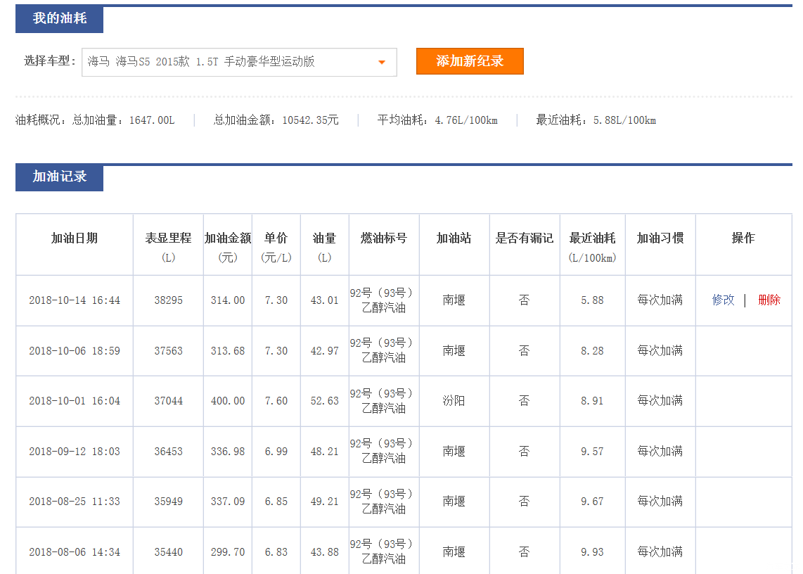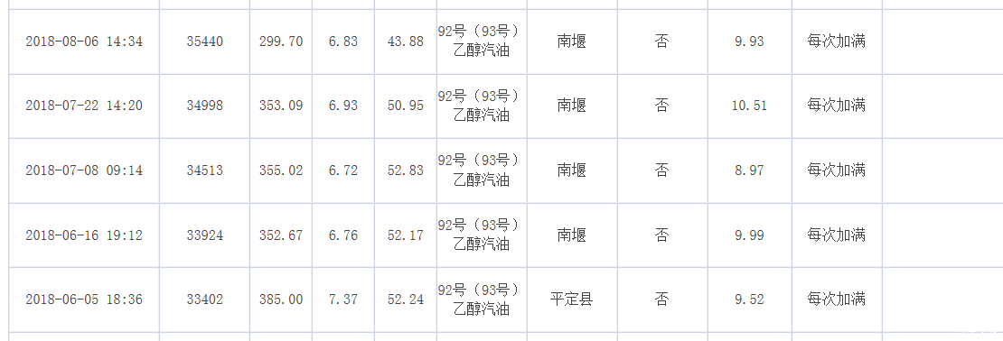 汽车之家记录的加油截图,夏季城市空调情况较高,季节变化关闭空调降耗,最近的是高速70--80公里跑的
