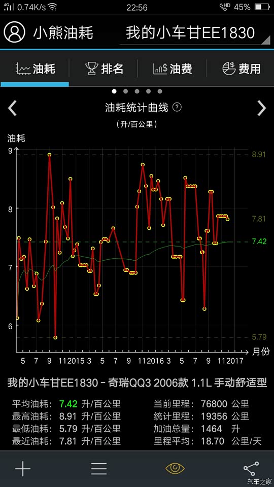 平常上下班都是超短途,所以油耗较高。常去省城(来回约500公里),一趟长途下来油耗低得怀疑人生,所以综合油耗是满意的。