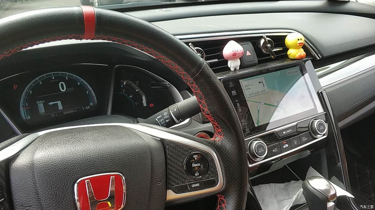 我很喜欢这种内饰风格,就是用料差了一些。搪塑材料也不少,就是黑布内饰太蛋疼。随随便便就有灰色痕迹,都不知道怎么来的。然后果断包了皮座椅,进口耐磨超纤皮,手感很好,当场选皮当场裁剪当场制作。我找了点皮的边角料用尽全力钥匙竟然戳不穿。有需求的少年可以找我。然后里面自己装了个360一代,今天早上早起一个小时,自己装的。毕竟我大思域做工垃圾,随便塞缝隙里。网上买了方向盘套,找时间自己缝。最好还有装逼神器,定速巡航贴片,就买了三十几块钱。