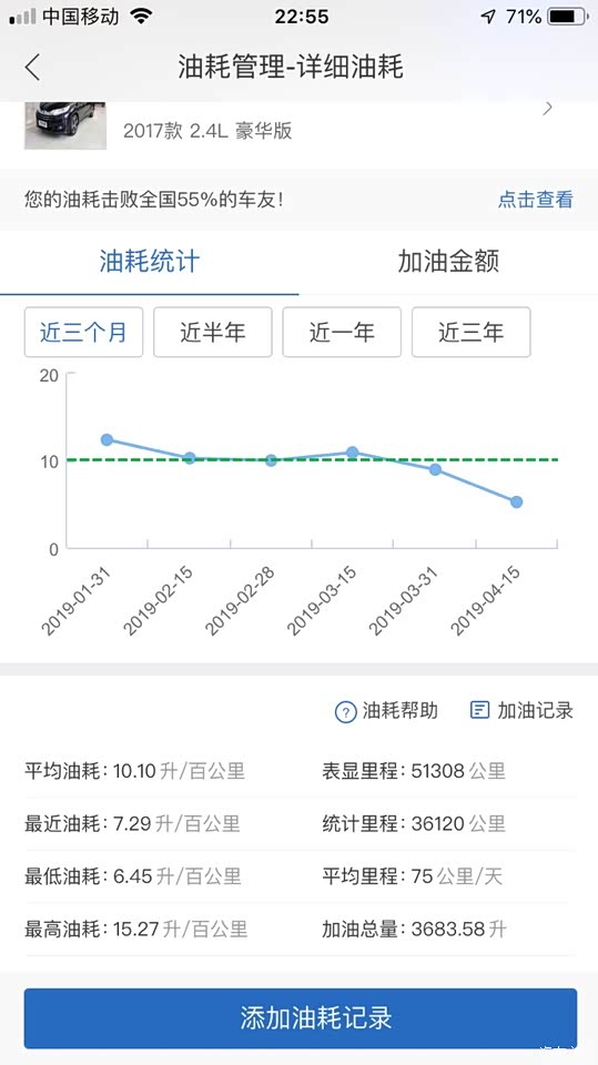 最近天天城区龟速前进4-5天加一次油平均下来要14升上下。高速有一个月左右未跑过了,应该要5 月1日才有机会跑吧!希望跑高速回到正常油耗吧!