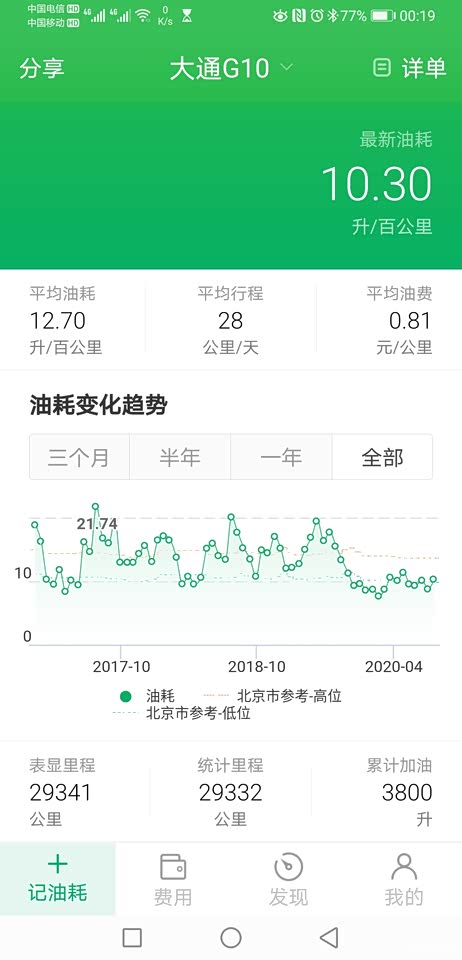 从接车以来,用小熊加油的数据记录,还是比较准的,高的21.都是城里上下班。低的8.34,都是出去玩。