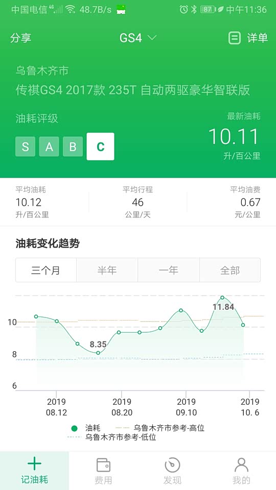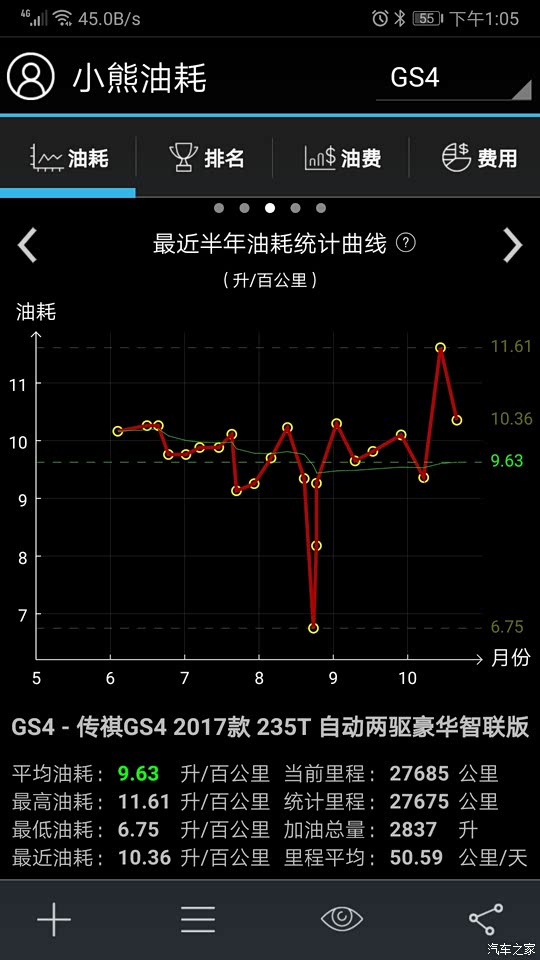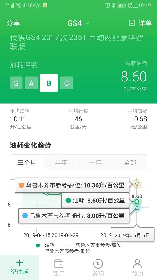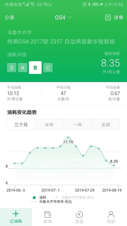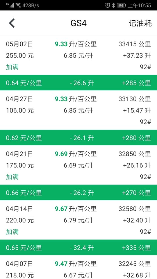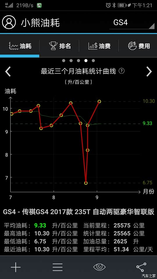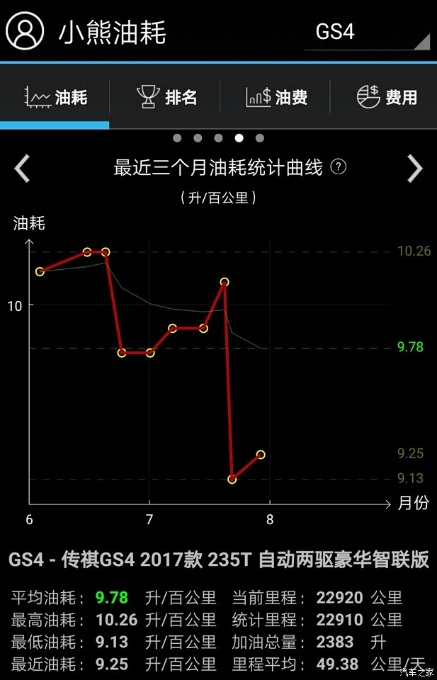 3月份才保养换过极护机油粘度比较低,最近天气凉爽也不需要开空调主要在市区跑,油耗有所下降表显8.1L百公里,小熊油耗记录最低9.3L/百公里,最高9.7L/百公里。市区里最省油的季节就这油耗了不会在低了。