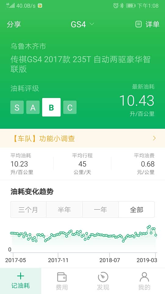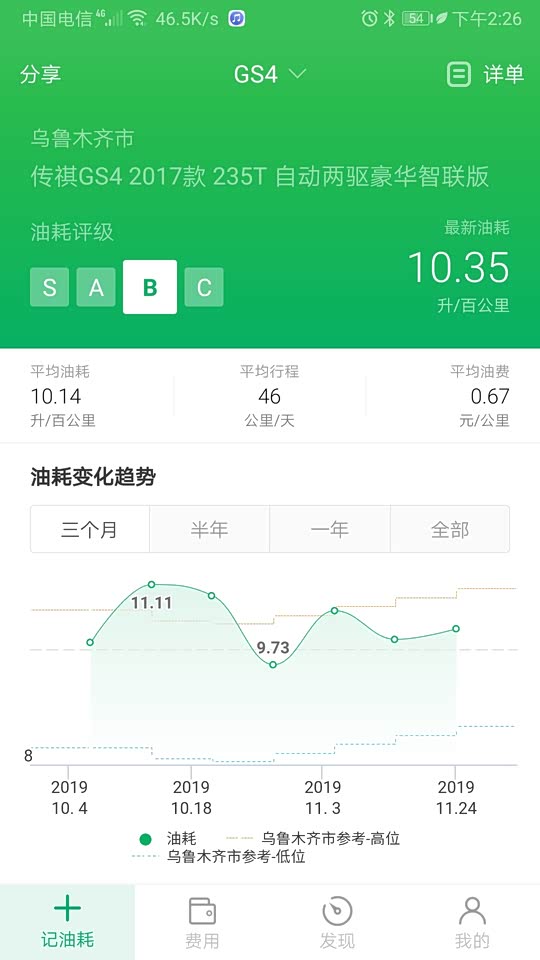最近基本在市区跑,路况不是很好到处修路、修地铁、修外环桥就没几条好路,天气冷了就没出过远门了。空调天冷了基本没用过换了雪地胎,市区油耗刚提车的时候开空调平均11L左右,现在纯市区各种堵烂路平均油耗9.7L以下就算在市区加上雪地胎也比前期省油,前期加上高速的路况平均才有10L以下的油耗。油耗方面减少可能和我换的嘉实多全合成机油,没开空调也有关目前比较满意了朋友博越车油耗13L同路况。