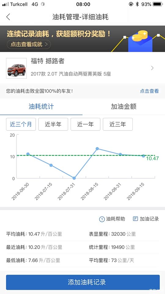油耗一直稳定在10.2-10.5升之间,和上次区别不大,最近刚从新疆回来,平均油耗10.2升,走过高速、乡镇限速道路,油耗很满意