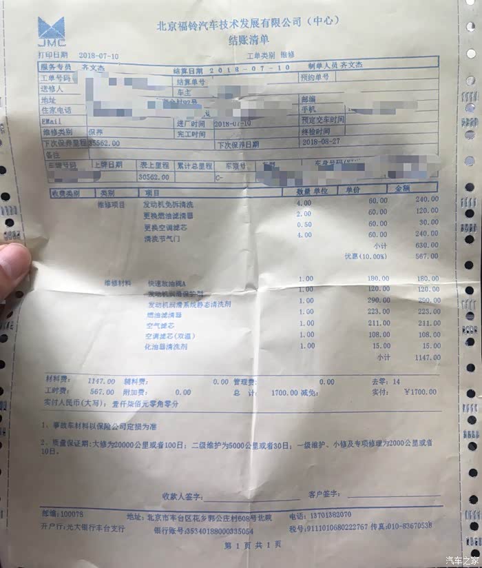 因为9月15日自驾东北三省一大圈,提前做了首保,换的机油、机滤,让师傅自习检查了一下车底没有漏油。油管震动情况我的车有时有,但不严重,让师傅调整了一下,改善了很多,空调加装了一节管。