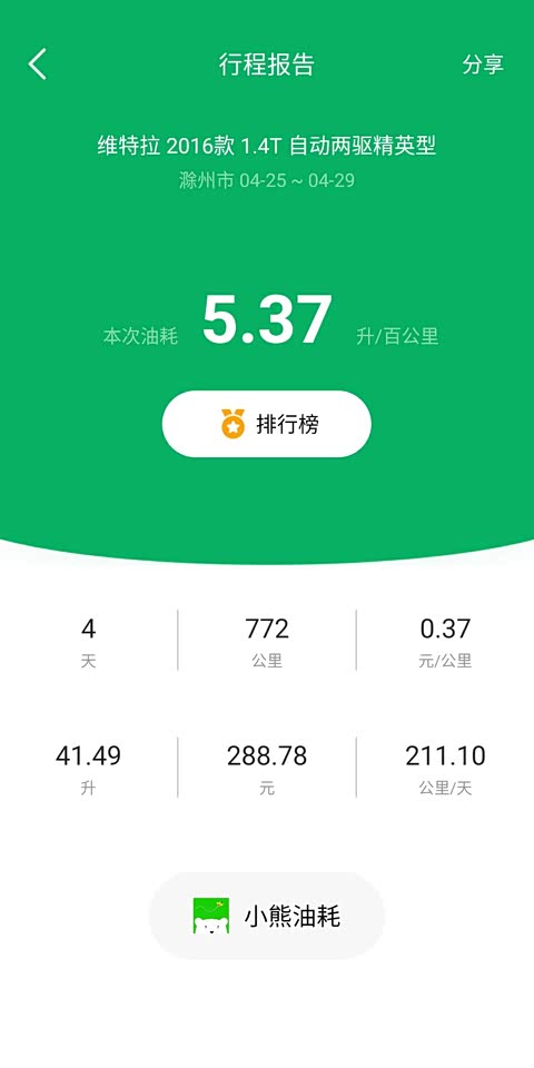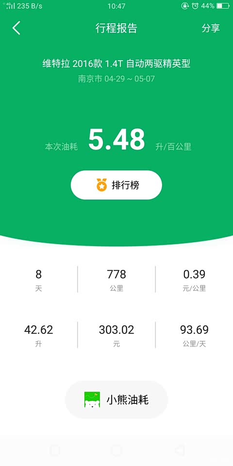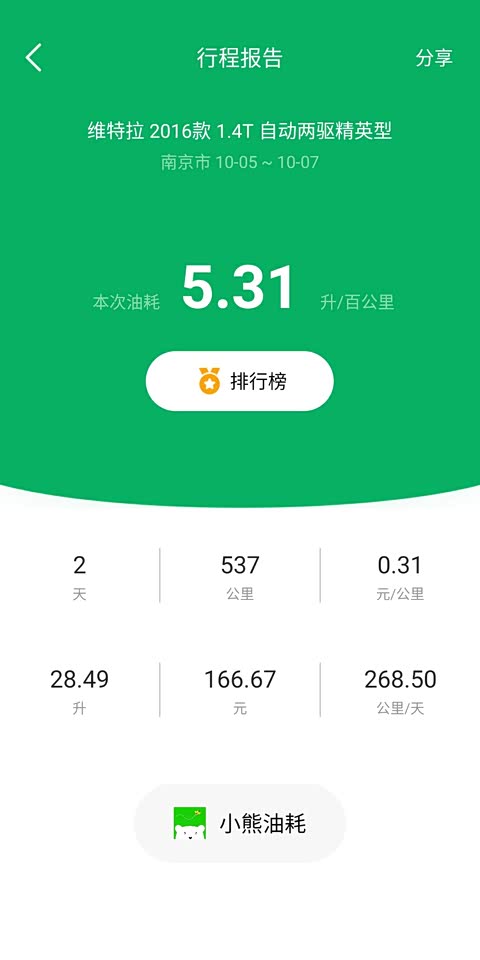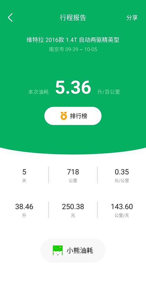 油耗一直都是表显6.2,实际也差不多国庆期间跑了一千多公里,油耗超低,其实一直维持在五毛一公里以下我觉得都很不错。