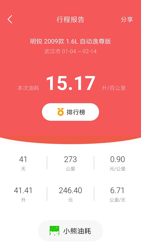 这个15点几的超高油耗是今年1月4日加的油,到2月14日重新加满的,小熊油耗记录显示这箱油只跑了273公里,15.17升/百公里,折合0.9元/公里,都快赶上1.8T车型的油耗了。期间还因为宝宝寒假和过年放假的原因,放地库停了2星期呢!好在算是一个月只加一次油吧!勉强能接受,毕竟这车城区短途开,油耗确实降不下来,加上铸铁的发动机水温上升慢,发动机多喷油也不是它的错。纯城区跑,短途冷车,暂时想不出降低油耗或者提升发动机水温的办法!